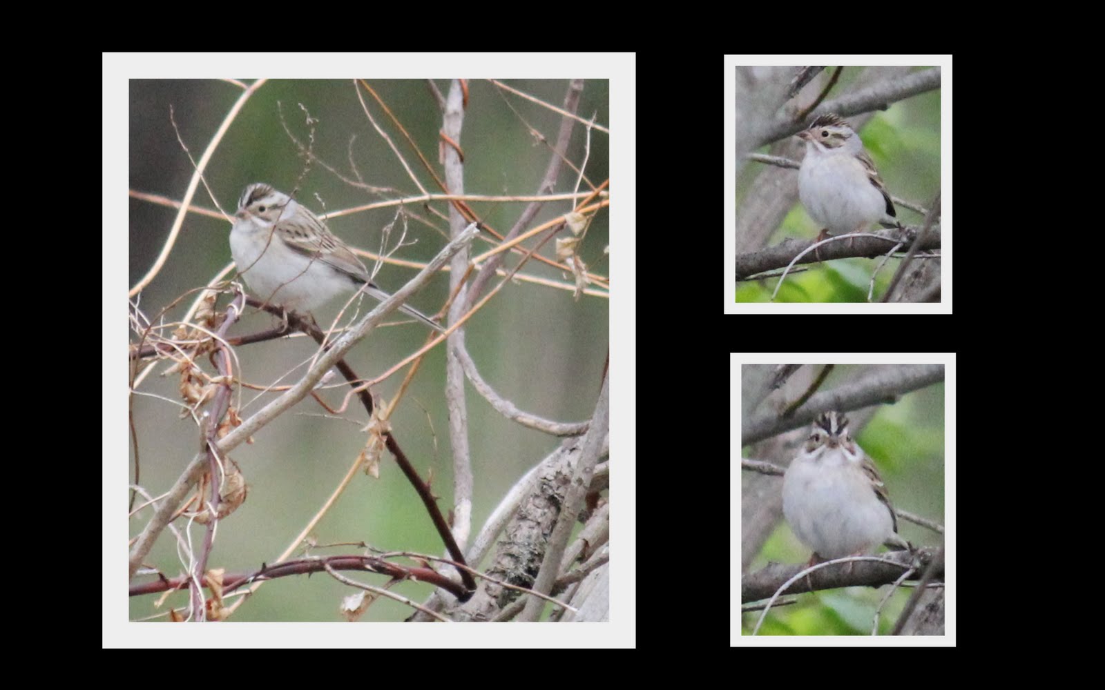 The highlight of my team's Spring Bird Count, besides a 19 species of warblers, was finding this Clay-colored Sparrow at Lyman Woods in Downers Grove. It was the only species that we had to document, since it was not expected to be found at this site. CCSP is a common bird in dry uncultivated brush of the northern prairies. It has probably benefited from the effects of human settlement and disruption of prairie fires, which has resulted in declining grassland habitat and increasing shrubs and trees in the northern Great Plains. CCSP is briefly present but rare in the Chicago wilderness during migration.